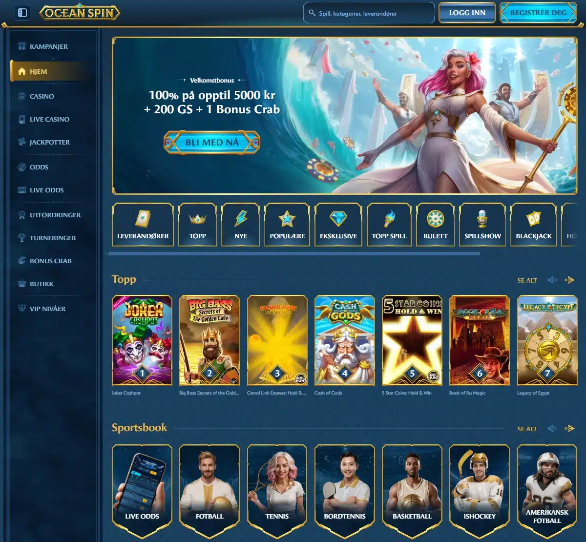 Men dette er ikke bare et vakkert sted å spille; Oceanspin ønsker deg velkommen med åpne armer og gir deg valget mellom en sjenerøs casinobonus eller en sportsbonus. Vi anbefaler casinobonusen, som gir deg 100 % opptil 5 000 kr, 200 gratisspinn og en spennende bonuskrabbe. Med gunstige omsetningskrav, spesielt på live casinospill, er dette en mulighet du ikke vil gå glipp av!