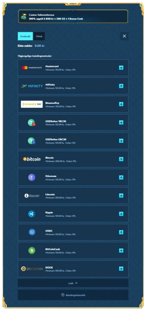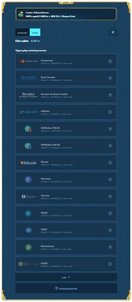 Hos Oceanspin Casino er det enkelt og trygt å gjøre innskudd og uttak. De tilbyr et bredt utvalg av betalingsmetoder som passer for norske spillere, inkludert norsk VISA gjennom MiFinity, Mastercard og flere kryptovalutaer. Transaksjonene er raske og sikre, slik at du kan fokusere på spillopplevelsen.
