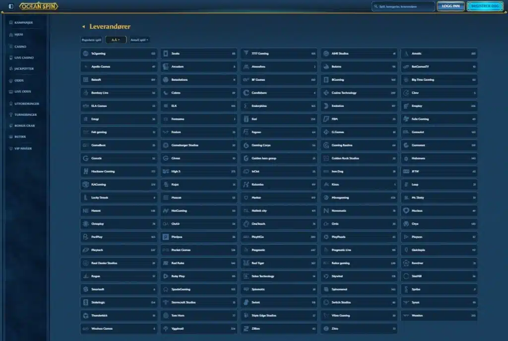 Oceanspin Casino byr på et enormt spillutvalg med over 12 000 casinospill fra mer enn 100 forskjellige leverandører. Enten du er fan av de nyeste spilleautomatene, klassiske bordspill eller live casino-opplevelser som får adrenalinet til å pumpe, finner du det her. Spillopplevelsen er sømløs og engasjerende, og du kan enkelt navigere gjennom det omfattende biblioteket for å finne dine favoritter.