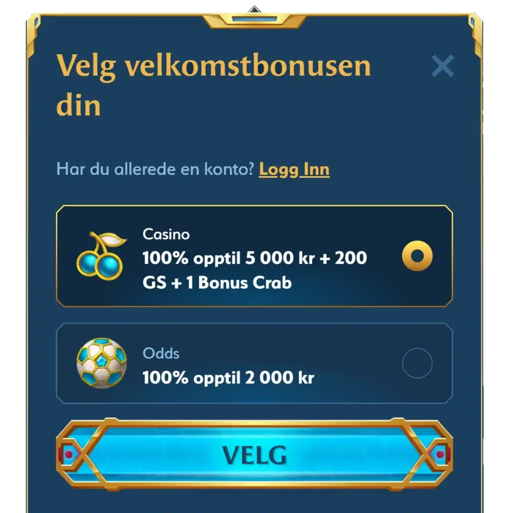 | Casinobonus | 100 % opptil 5 000 kr + 200 gratisspinn + 1 bonuskrabbe |