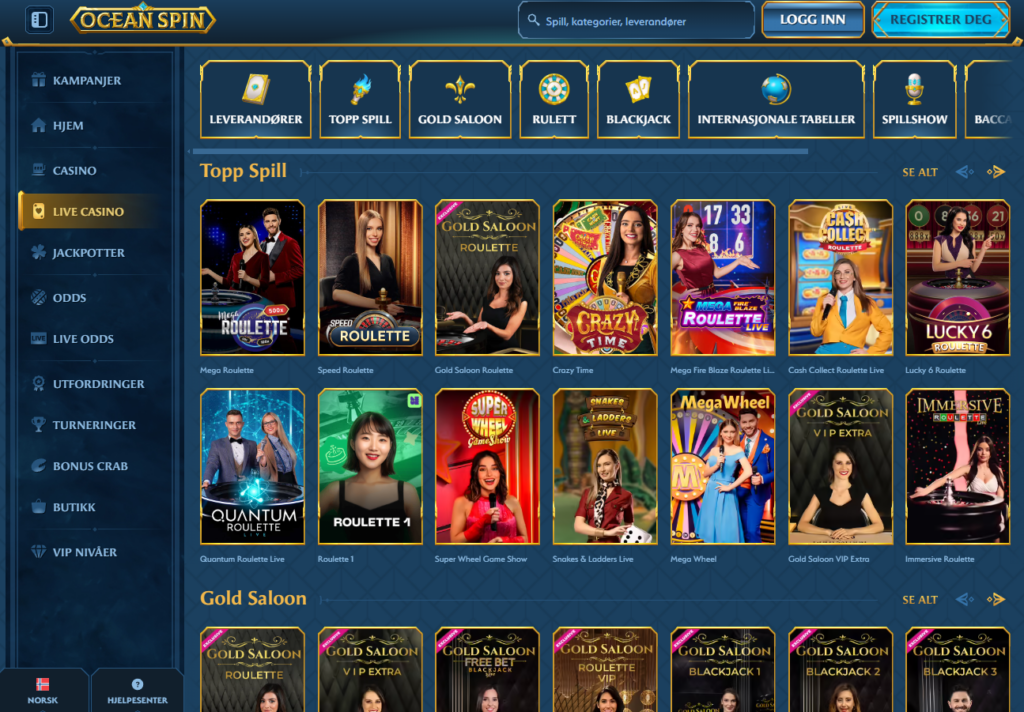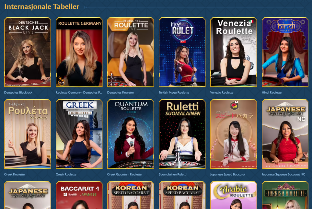 Casinoer med live casino, live dealere, blackjack, baccarat, roulette og gameshow for norske spillere.