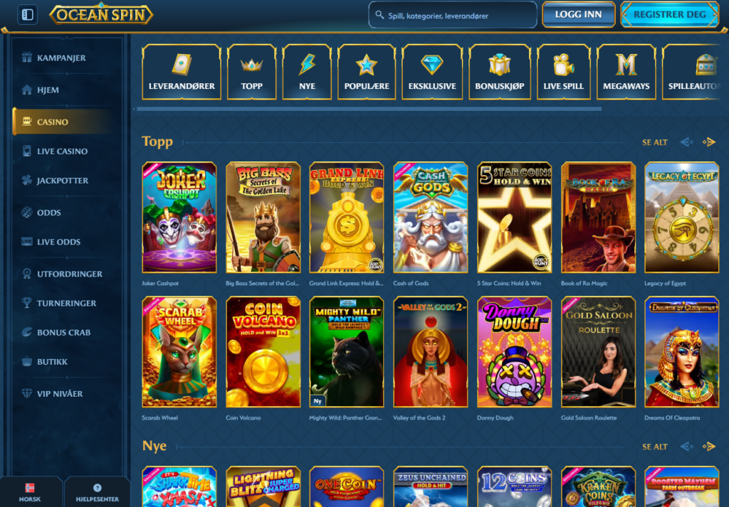 Oceanspin Casino skiller seg ut som et av de beste casinoene for pengespill på grunn av sitt enorme spillutvalg, sjenerøse bonuser og fokus på norske spillere. Med over 12 000 spill fra ledende leverandører, finner du alltid noe nytt og spennende å prøve. Deres fokus på sikkerhet, rettferdig spill og ansvarlig spilling gjør det til et trygt og pålitelig valg for dine pengespillopplevelser.